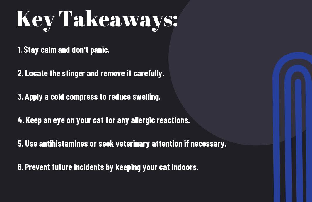 - Prevent Future Stings: Take steps to prevent future bee stings by keeping your cat indoors, using pet-safe insect repellent, and removing any flowering plants or beehives from your yard.