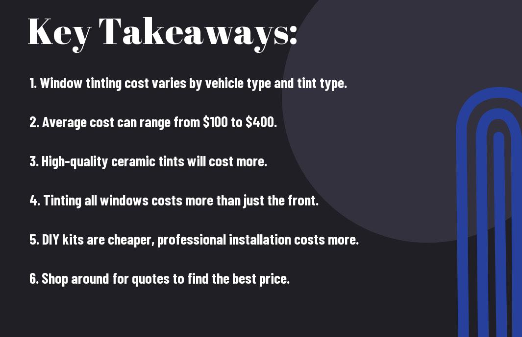 With this in mind, when considering the cost of tinting your car windows, it is important to factor in various elements such as the size of your car, the type of tint you want, and the skill level of the installer. On average, you can expect to pay anywhere from $100 to $400 for a quality tint job, but this can vary depending on the factors mentioned above. Keep in mind that while it may seem like an additional expense, the benefits of tinting your car windows, such as UV protection, privacy, and reduced heat, make it a worthwhile investment for both your car and your well-being.