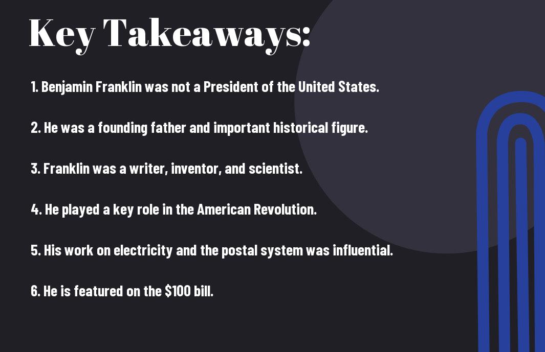 Amidst the pantheon of American historical figures, Benjamin Franklin stands as a towering intellect and influential statesman. However, contrary to popular belief, Benjamin Franklin was never a President of the United States. In this blog post, I will delve into the life and accomplishments of Franklin, shedding light on his numerous contributions to American society and the world at large. If you’re interested in learning fascinating details about this remarkable figure, be sure to check out Fun Facts About Benjamin Franklin to expand your knowledge.
